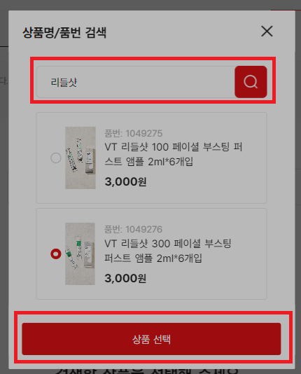 3.매장 상품 찾기 클릭 ▶️ 상품명/ 품번검색합니다.( 전 리들샷이라고 검색했습니다.) ▶️ 아래 그림처럼 2가지 종류 상품 선택이 가능하고