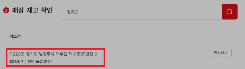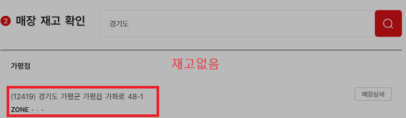 2. 매장선택후 매장별 재고 상황이 아래와 같이 재고 확인이 가능합니다. 먼저 가평점을 확인해 보았습니다. 재고없음으로 다시 경기도 덕소점을 확인해 봤습니다. 역쉬 현재 품절입니다.라는 문구로 재고확인이 가능합니다. 계속해서 근처에 매장을 조회하셔서 재고를 확인하고 구입하시기 바랍니다.