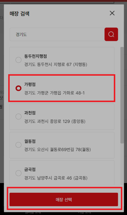 1.매장 재고 확인이 가능합니다. ▶️ 매장 검색 후(예, 경기도 or 우리동네 매장명 바로 입력) 매장 선택합니다.