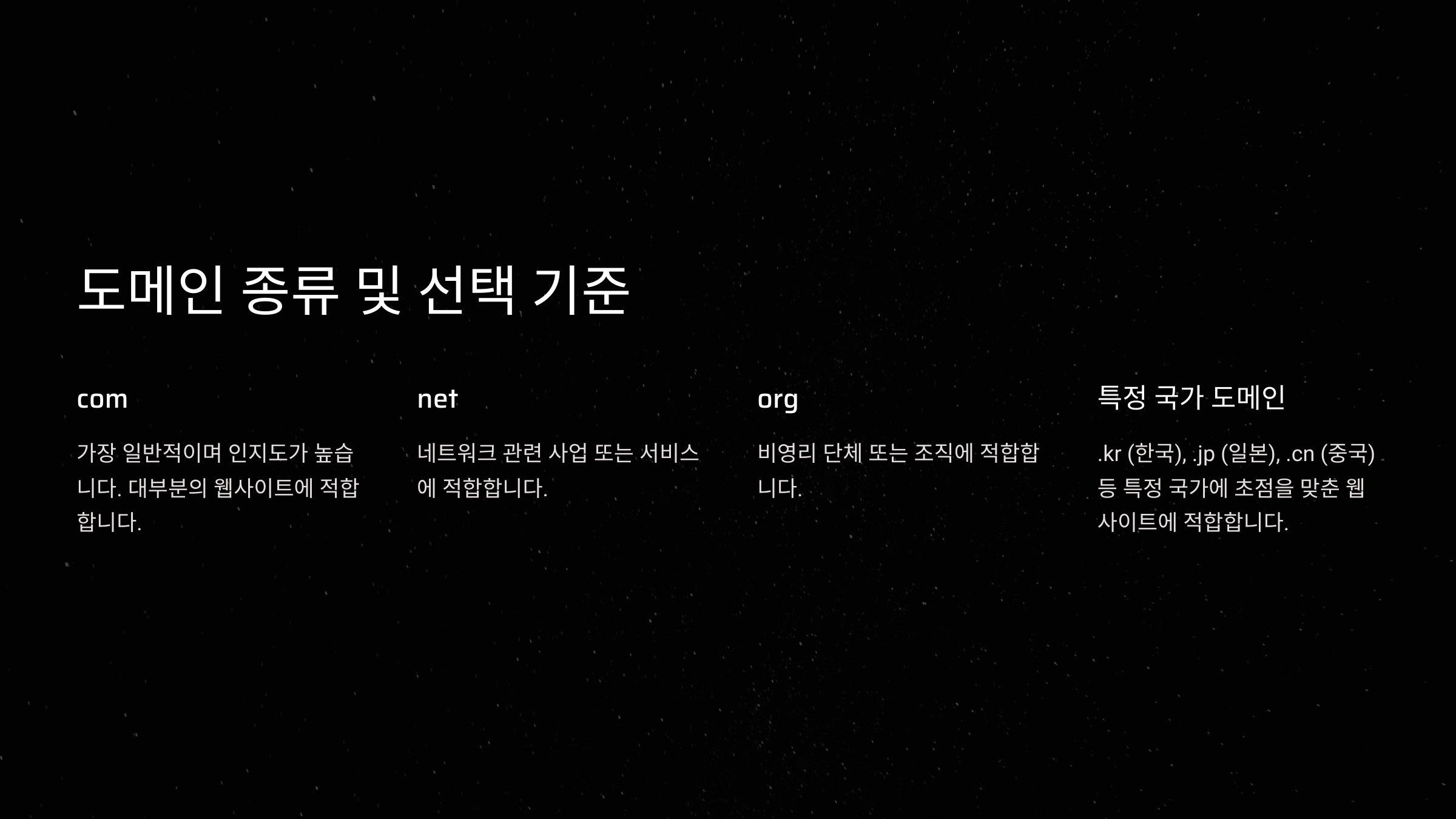 | 국가 코드 최상위 도메인 (ccTLD) | .kr, .jp, .cn, .us | 국가별 타겟팅에 유리함 | 국내 및 특정 국가 대상 비즈니스 |