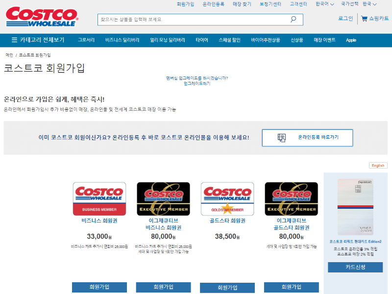 - 코스트코 온라인몰 이용을 위해 회원가입이 필요하며 기존 회원은 온라인에서 등록 가능하며, 처음 이용하는 경우에는 회원가입 메뉴를 통해 가입할 수 있다.