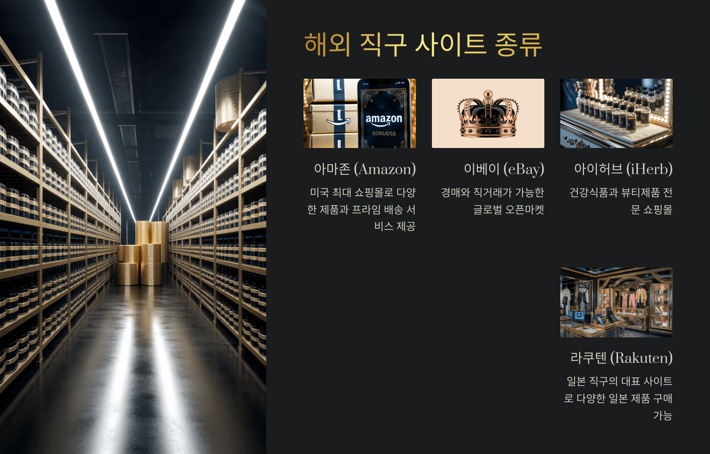 | 구매 대행 사이트 | 아이포터, 몰테일, 오마이집 | 배송 대행, 한글 서비스 지원 | 국내 카드 결제, 합배송 |